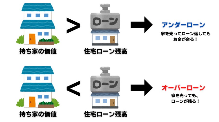 - 次に住宅ローンがある場合の財産分与について考えてみましょう。住宅ローンがある場合、不動産の価値が住宅ローンの残高を上回っている状態(アンダーローン)と、不動産の価値よりも住宅ローンの残高が多い状態(オーバーローン)で事情が異なります。