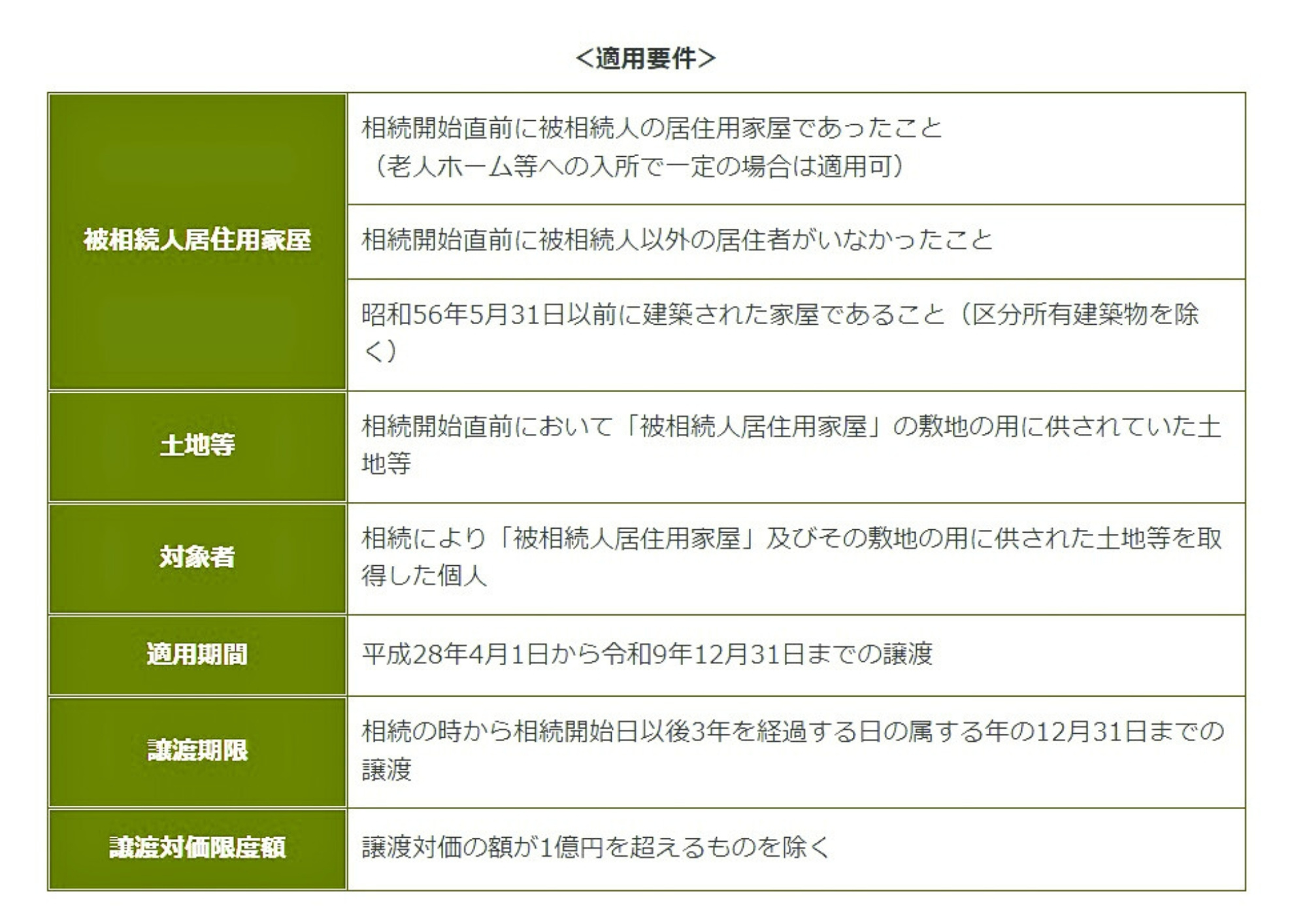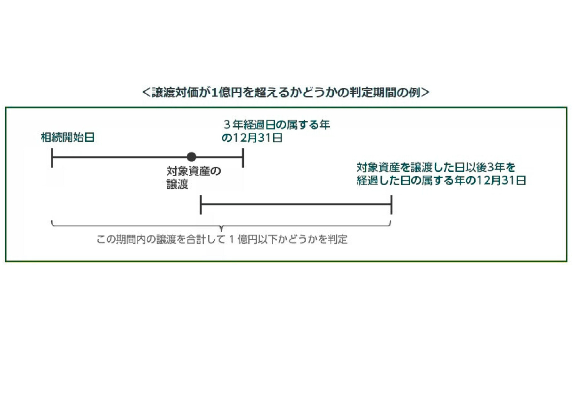 譲渡対価の額が 1億円を超えるかどうかは、相続人が共同で被相続人居住用家屋とその敷地を相続し、その後、時期を前後して各相続人がこれらの資産を譲渡した場合などには、相続開始の日から最初に譲渡をした日以後3年を経過する日の属する年の12月31日までの譲渡を合計して1億円以下かどうかを判定することになります。